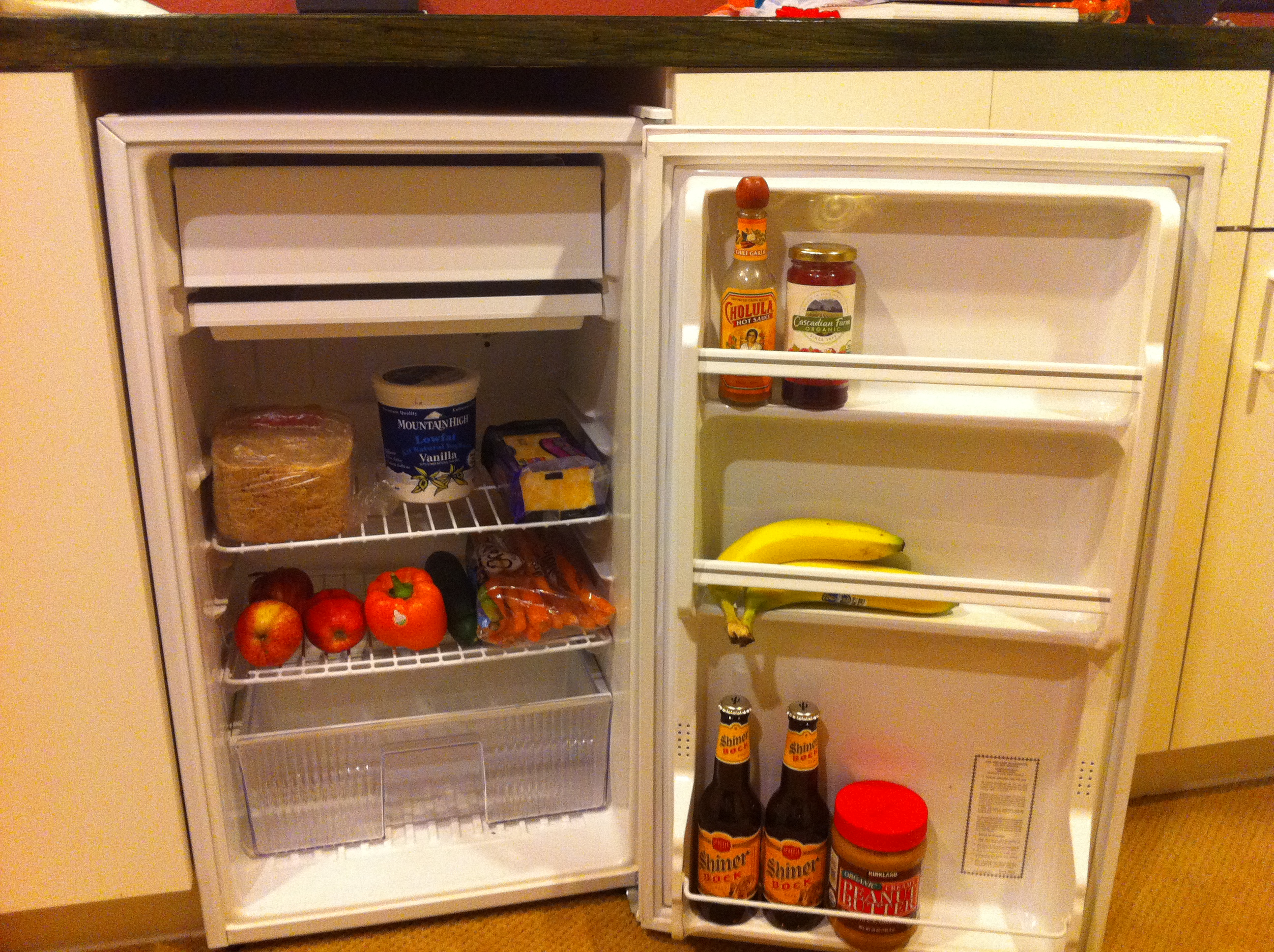Stock the fridge with a loaf of whole wheat bread, natural peanut butter, a jar of good jam, some bananas, apples, carrots, cucumbers and any other snacking vegetables, almonds, hot sauce, cheddar cheese, nice yogurt, and even some Beer for when you work late with the coworkers. Also bring your own plate, cup, and cutlery.