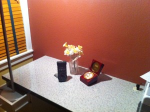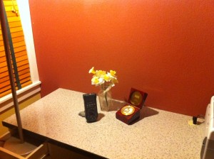 Here’s the same scene lit up with a “warm white” CFL bulb. Note the more reddish hue (which I find a bit nicer) and the continued wide light dispersion.