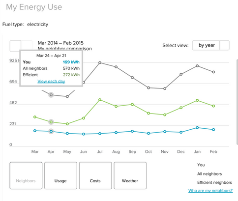 Further Inspiration: in response to this post, a reader named Mark sent me the annual power graph, for his 2200 SF house in Minneapolis. His electric company allows you to compare your consumption to that of your neighbors. Of course, the Mustachian line is the blue one way, way down below any of the other ones, quietly saving him loads of cash.