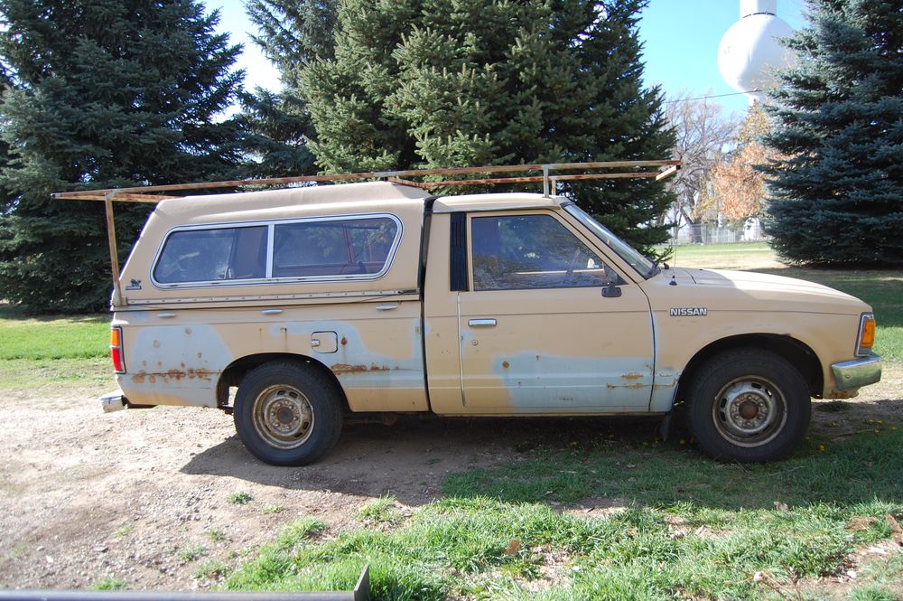 Back when money was tighter (I only had $700,000 in the bank but at least my house was paid off), I had this older truck – a 1984 Nissan compact pickup. This thing built multiple houses and kitchens, carried steel girders and landscaping materials, and protected me from weather of all seasons. It has an aftermarket cupholder on the driveshaft hump which is currently full of hardened surf wax and 10 Peso coins.