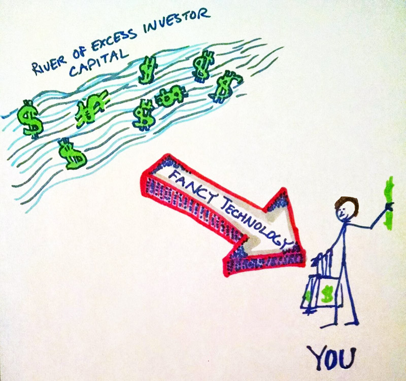 I have also been frustrated with the perpetually low-tech environment of lending. Although I now maintain a peaceful balance sheet with no debt, I’ve gone through at least ten mortgages and refinancings over the past 15 years, and every one was more trouble than it needed to be. Sometimes I’d find myself sitting in a bank employee’s cubicle slowly reciting figures while she typed them into boxes of some rusty old Windows XP application. Other times I’d be signing and scanning paper documents and using various hacks to send them in the antique “Fax” format to bankers who didn’t even have a way to open a PDF.