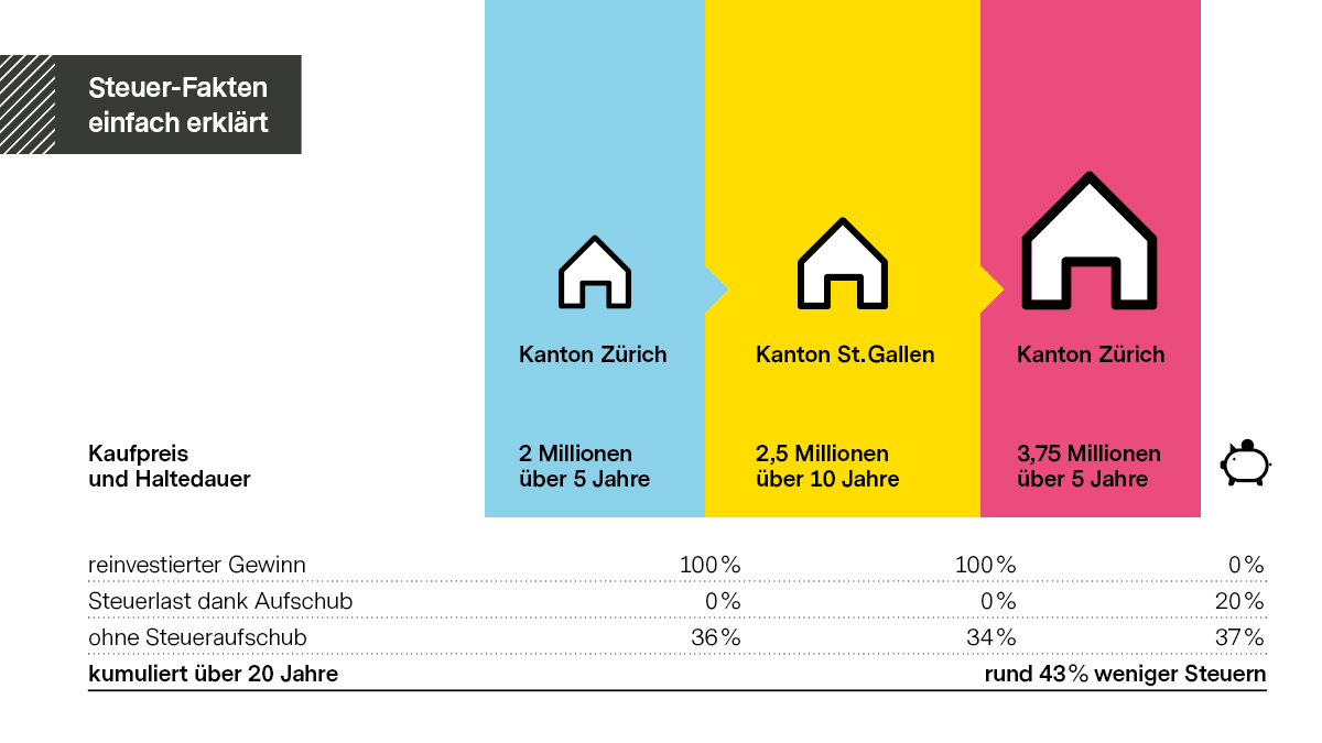 Die erste Immobilie in Zürich wird nach fünf Jahren mit einem Gewinn von 500 000 Schweizer Franken verkauft. Der Gewinn wird komplett in eine Ersatzbeschaffung im Kanton St. Gallen investiert, wodurch die Grundstückgewinnsteuer aufgeschoben werden kann. Nach zehn Jahren wird auch diese Immobilie verkauft. Der Gewinn von 1,25 Millionen wird wiederum vollständig in eine letzte Ersatzbeschaffung im Kanton Zürich investiert. Nach insgesamt 20 Jahren (kumulierte Haltedauer) erfolgt der letzte Verkauf für 4,5 Millionen ohne weitere Ersatzbeschaffung. Daraus resultiert ein kumulierter Gewinn von 2,5 Millionen Schweizer Franken. Dank der Möglichkeit, die Grundstückgewinnsteuer zweimal aufzuschieben, resultiert über 20 Jahre eine Steuerersparnis von rund 43 Prozent oder 378 910 Schweizer Franken.